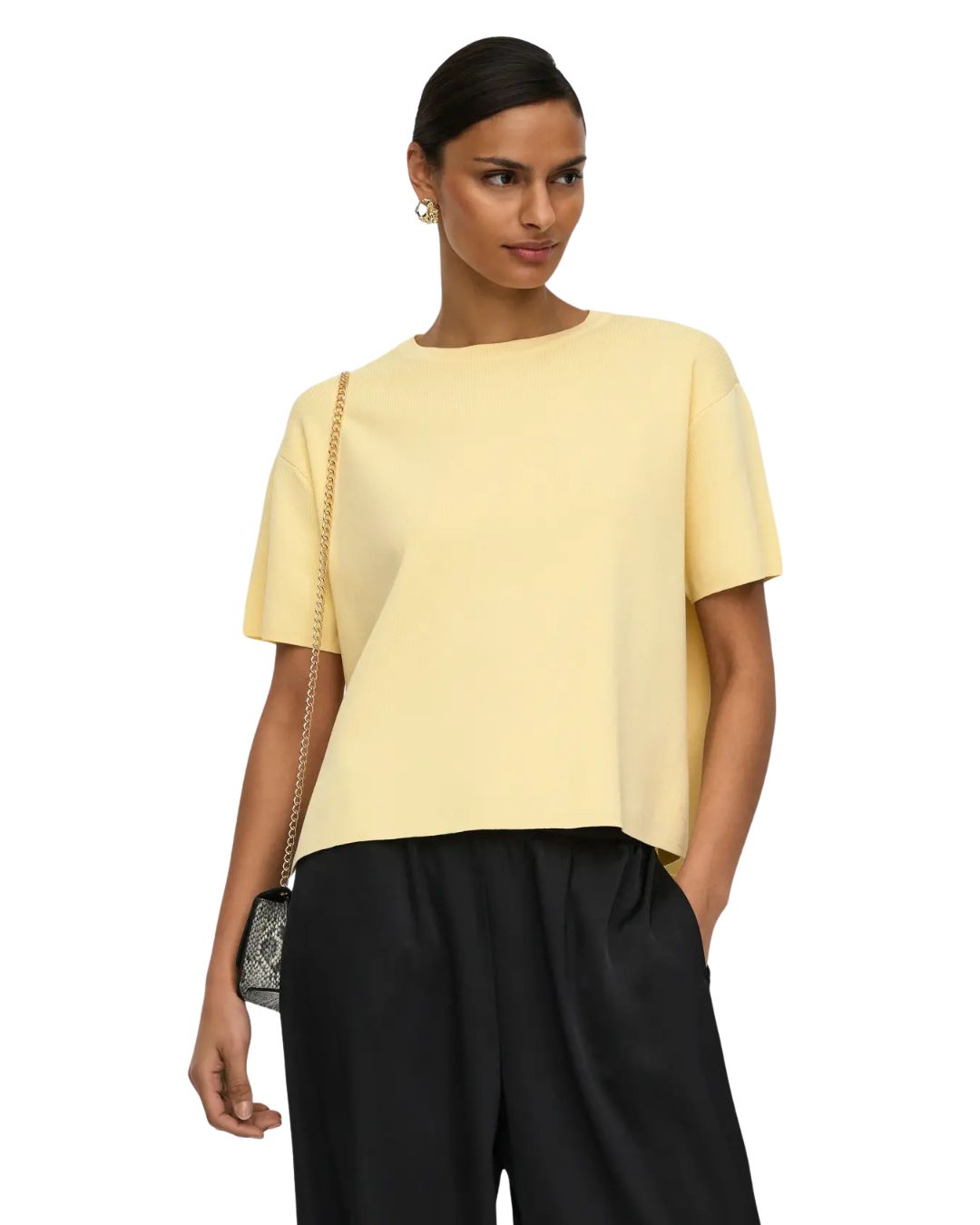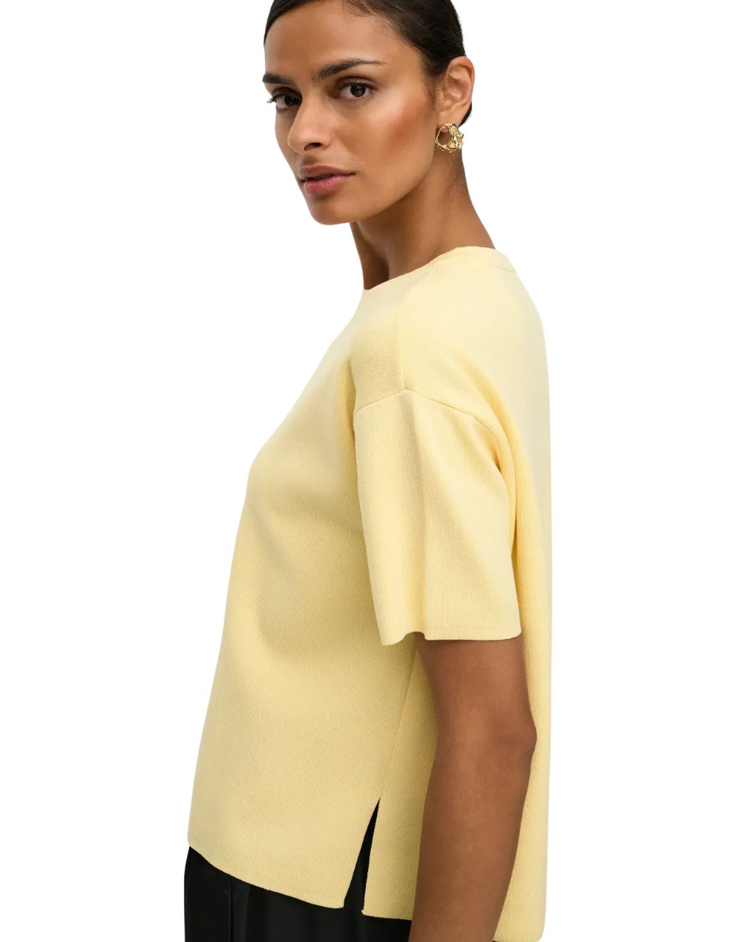 Mjuk och tätstickad topp i en avslappnad, lös passform. Modellen har rund halsringning, korta ärmar och en diskret slits i sidan som ger extra rörelsefrihet och en modern känsla. Perfekt att bära både till vardags och vid mer uppklädda tillfällen. Matcha gärna med Astra kjol för ett stilrent och komplett set.