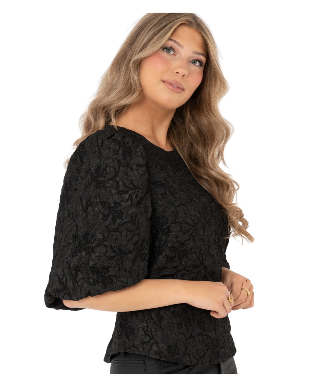 Blusen är gjort i ett trendigt strukturtyg som ger blusen ett fint oregelbundet uteseende trots att den är enfärgad. Ledig passform med lätt rundad nederkant och vid båtformad hals. I nacken är en lite öppning gjord som stängs med hjälp av de vackra satinbanden i samma färg som övriga toppen. De vida ballongärmarna ger toppen ännu mer dramatisk effekt.