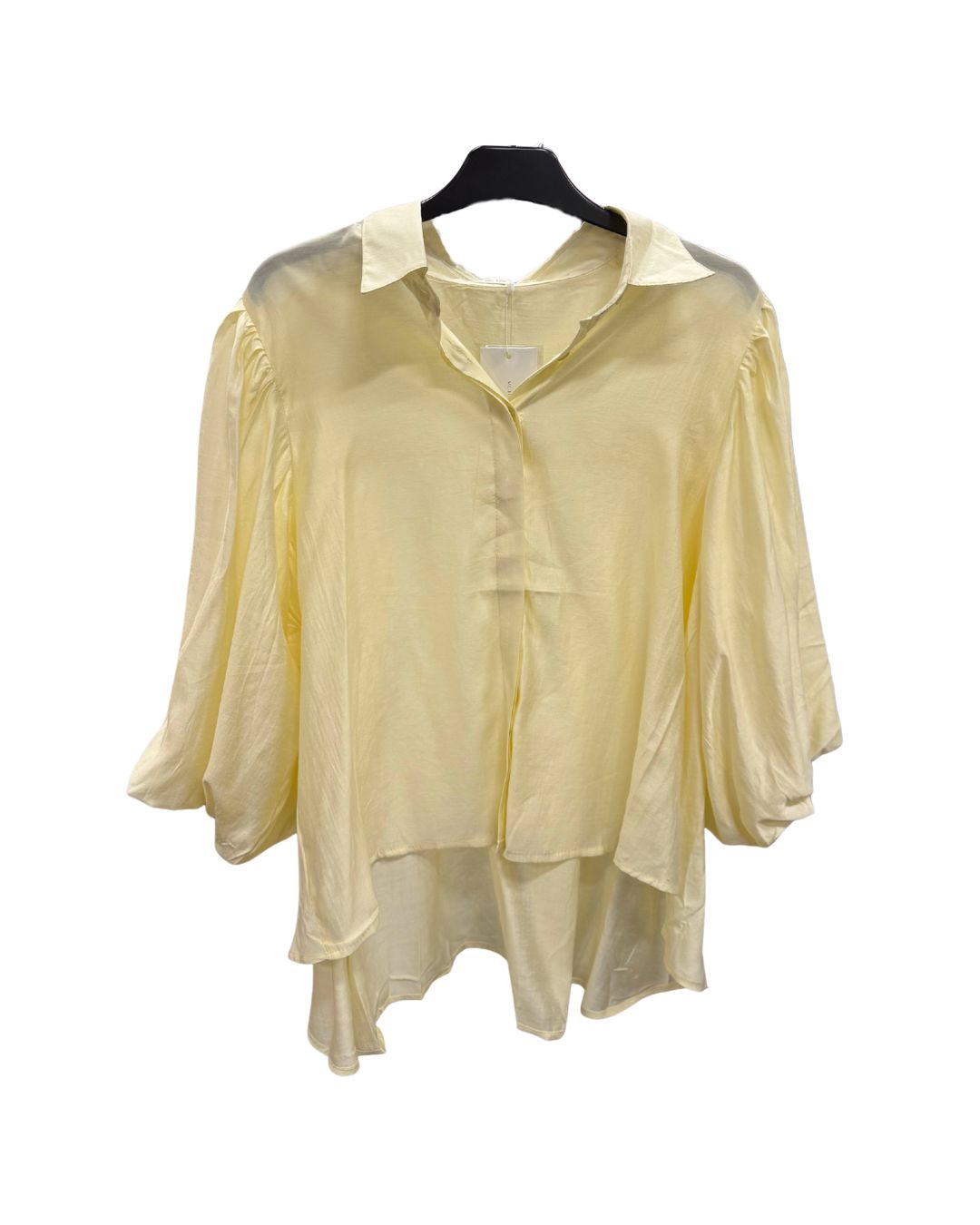 Caramelle Blus är tillverkad i mjuk viskos som faller vackert. Den har trendiga ballongärmar, dolda knappar framtill och en längre bak än fram för en modern silhuett. Ett mångsidigt plagg som passar både till vardag och fest.