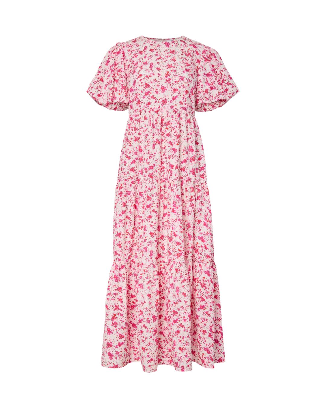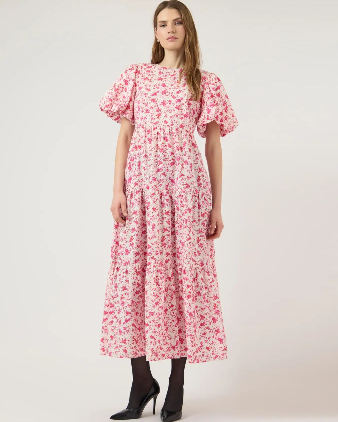 En feminin och luftig klänning med romantiskt blommönster och vackert fall