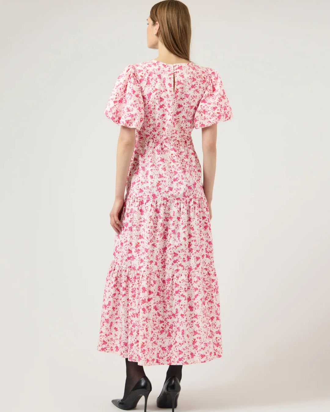 Den markerade midjan och den ledigt fallande kjoldelen i flera nivåer ger ett fint rörelsemönster och en smickrande passform. Längden gör den enkel att bära både med klackar för en mer uppklädd look eller med sneakers och sandaler för en avslappnad vardagsstil.