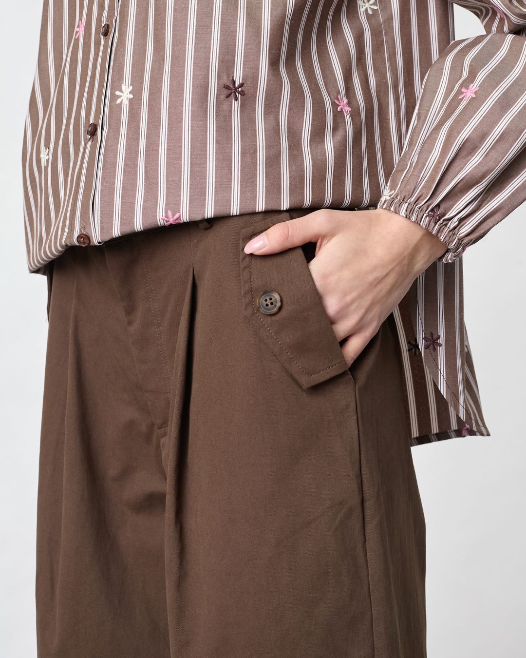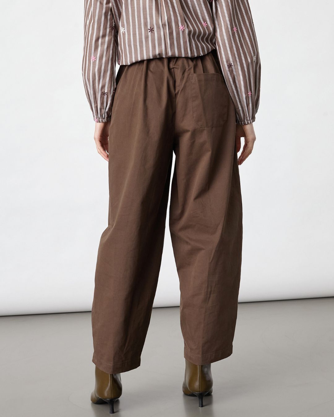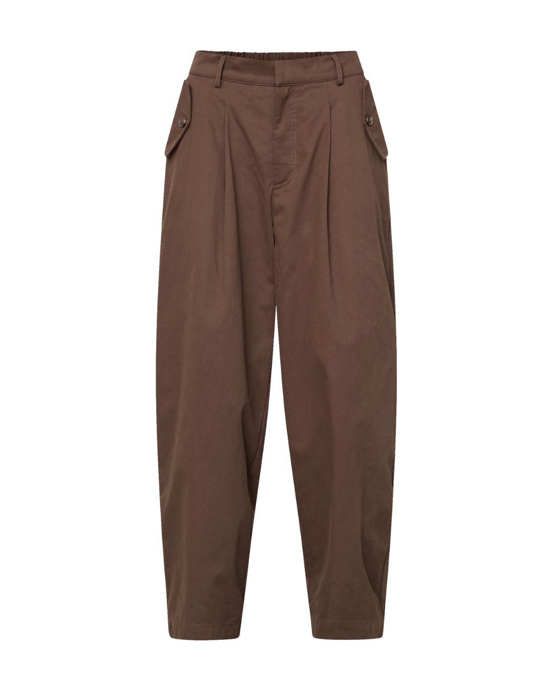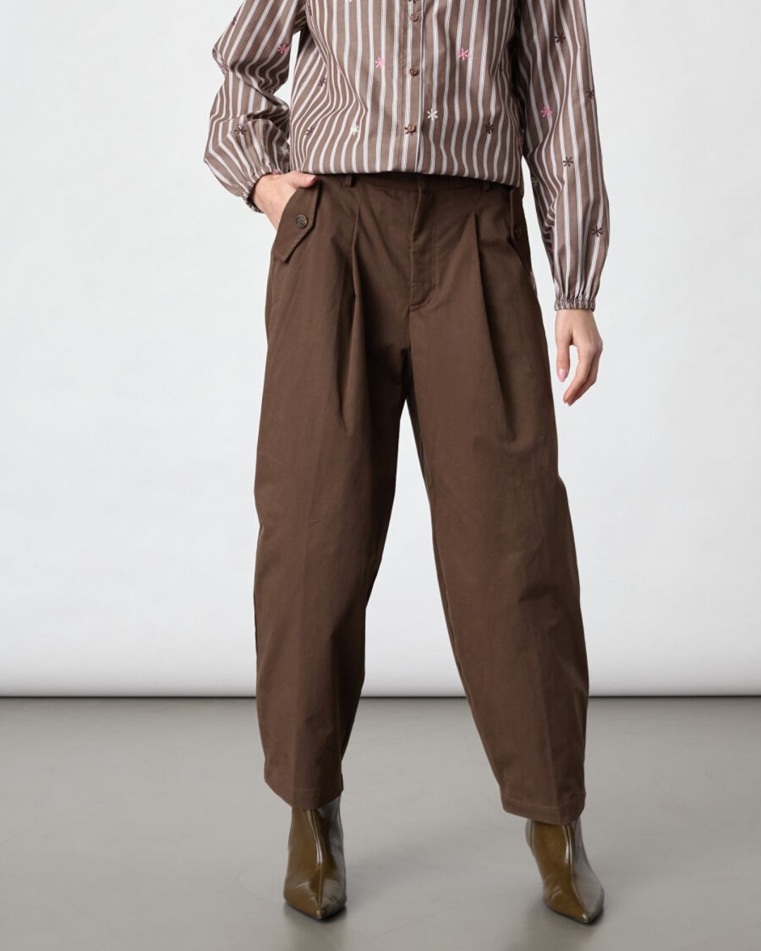 Barell Byxa är tillverkad i 100 % bomull och kombinerar komfort med stil. Den höga midjan och de vida benen ger en modern silhuett, medan eleganta veck och knappdetaljer tillför en sofistikerad touch. Perfekt för både vardag och fest.