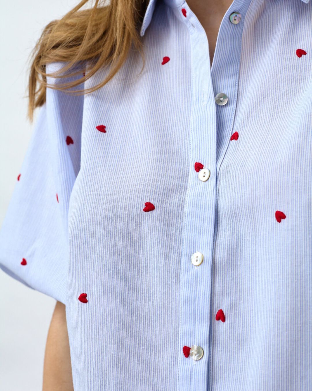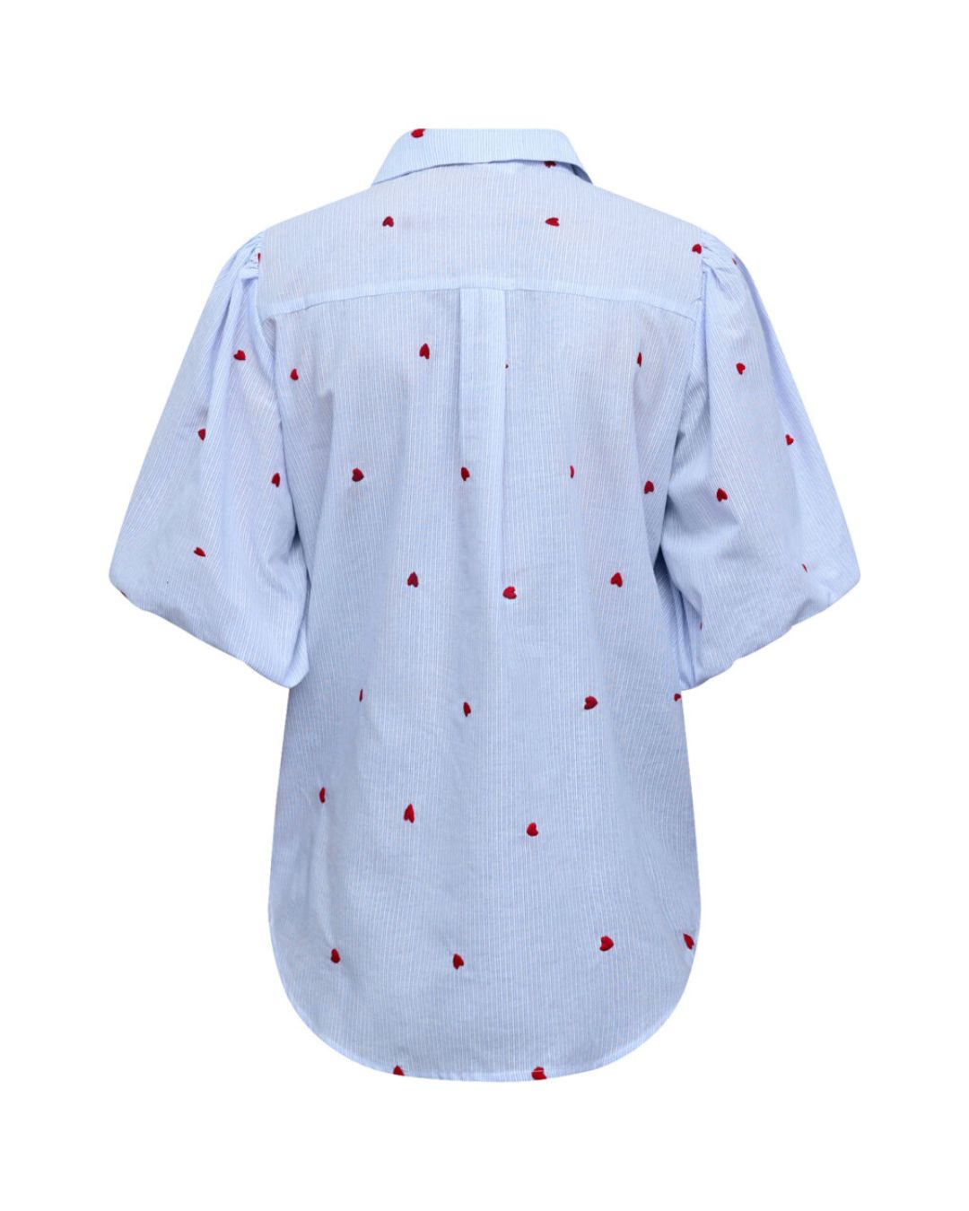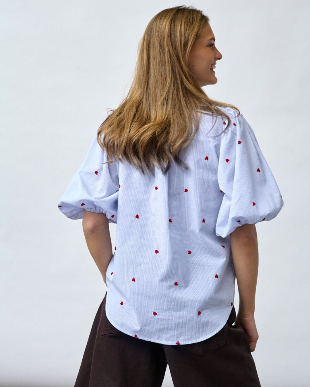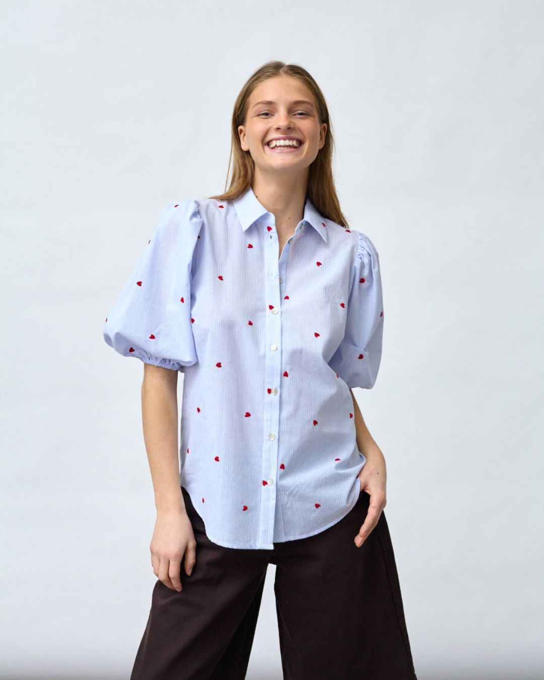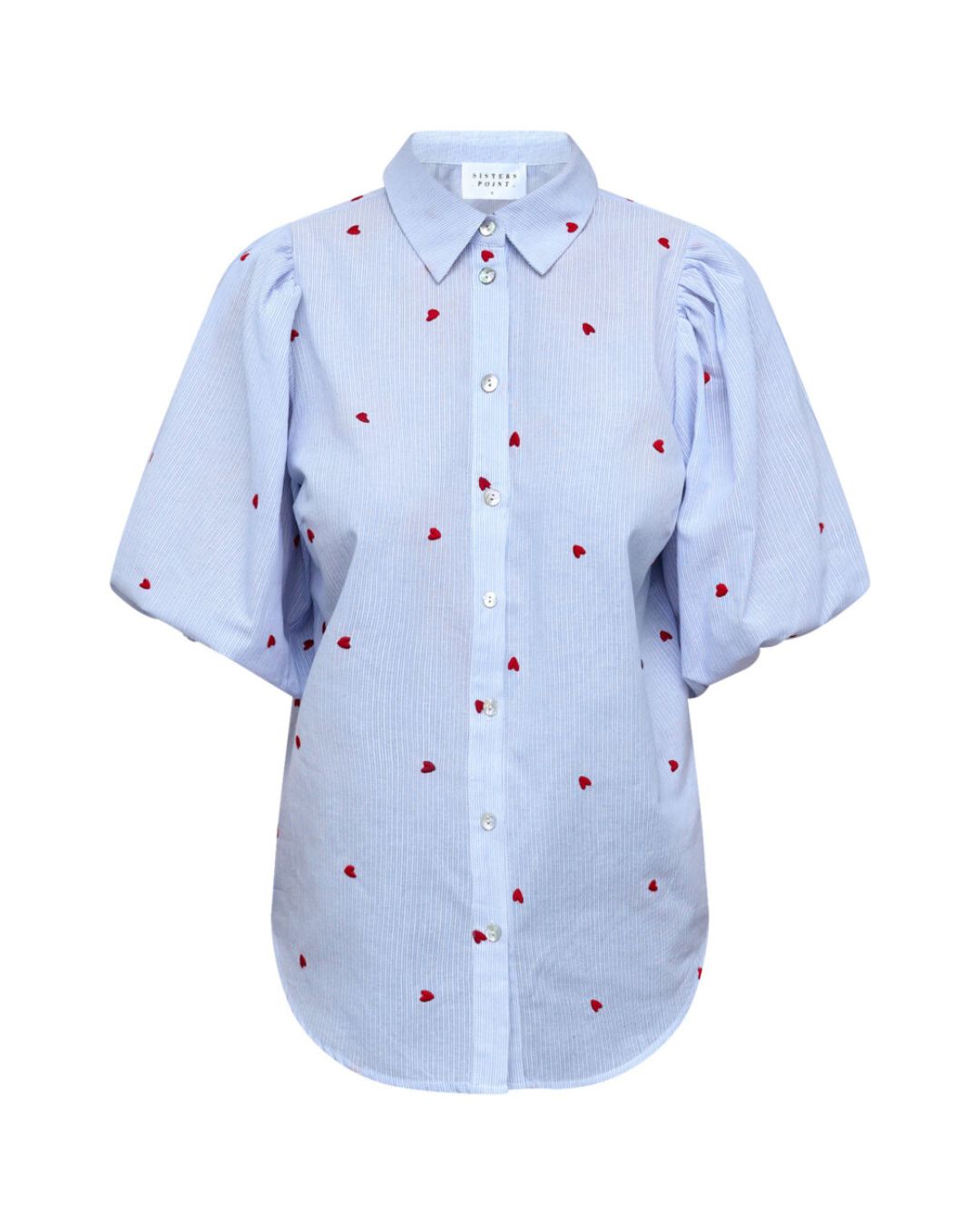 Denna charmiga skjorta från Sisters Point kombinerar en romantisk design med moderna detaljer. Den ljusblå basen med små röda hjärtan ger plagget ett lekfullt uttryck, medan de trendiga 3/4-långa puffärmarna tillför en mjuk och feminin silhuett. Den klassiska skjortkragen och knappstängningen framtill skapar en tidlös balans till det dekorativa mönstret.