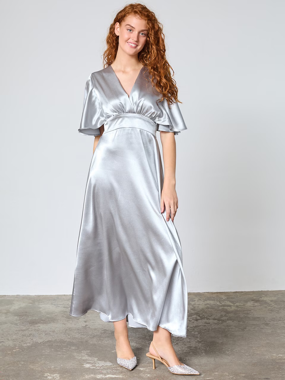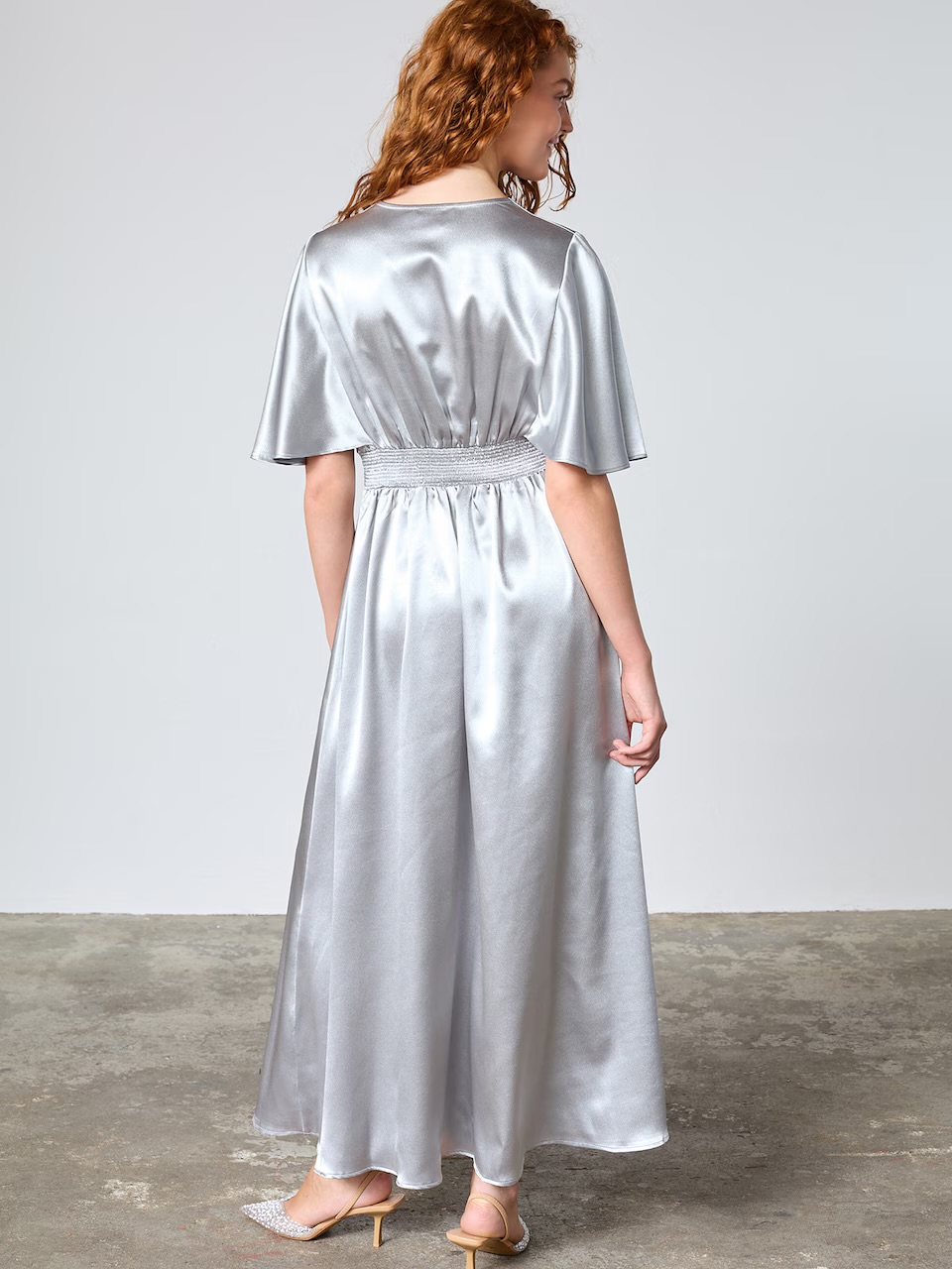 Fin och festlig klänning med vackra detaljer. Den har en feminin passform med en smock på baksidan. Klänningen har en v-ringning och lösa ärmar.