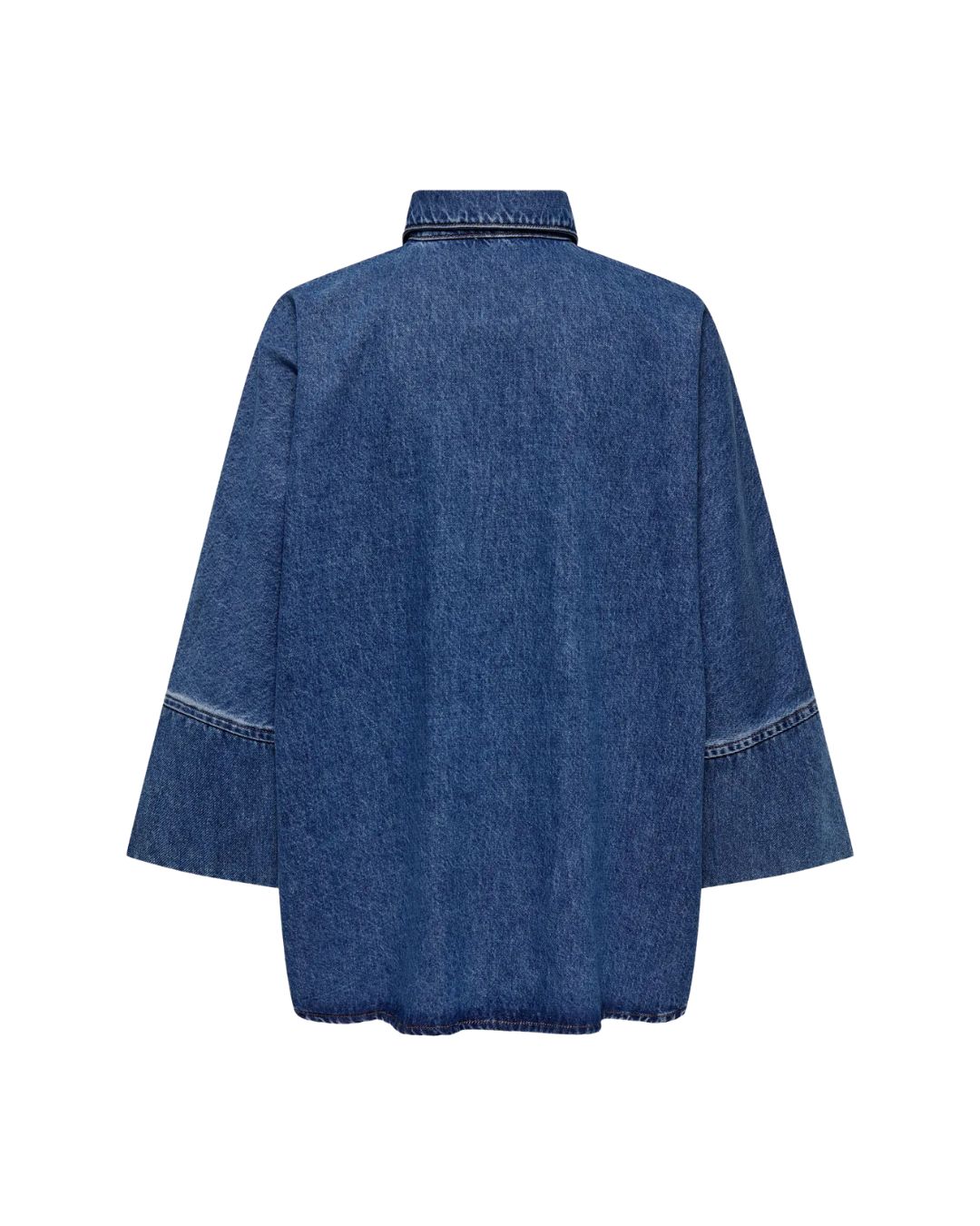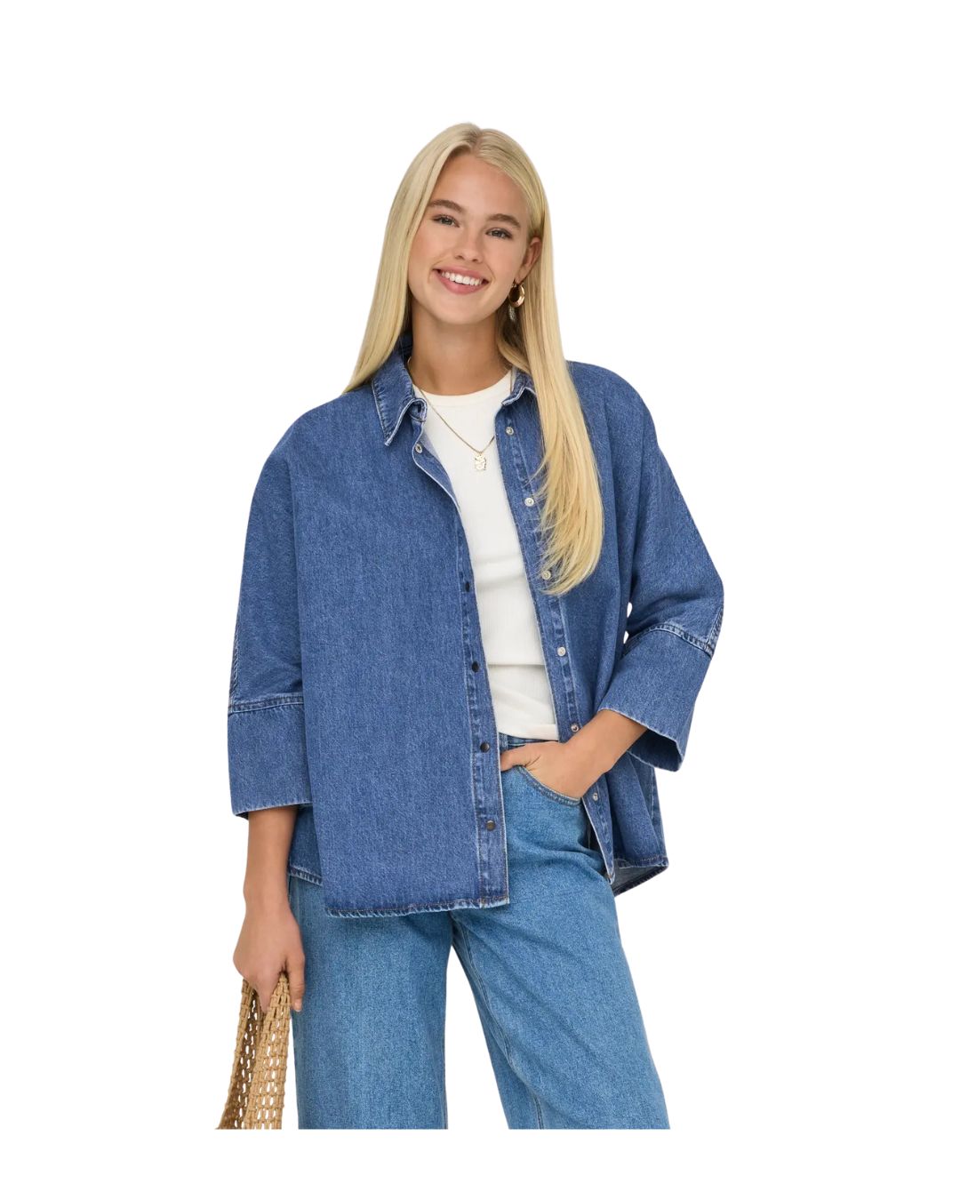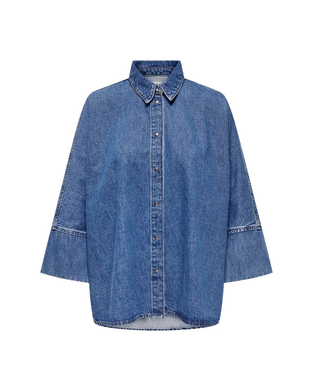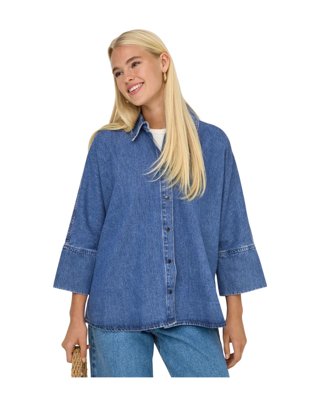 Denimskjorta från Only i en oversize modell, 3/4dels ärm och längre bak. Denna skjorta går att använda knäppt men också öppen över en t-shirt som en overshirt.