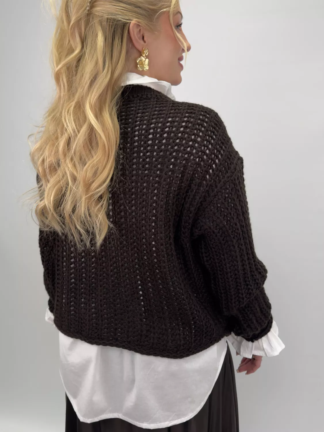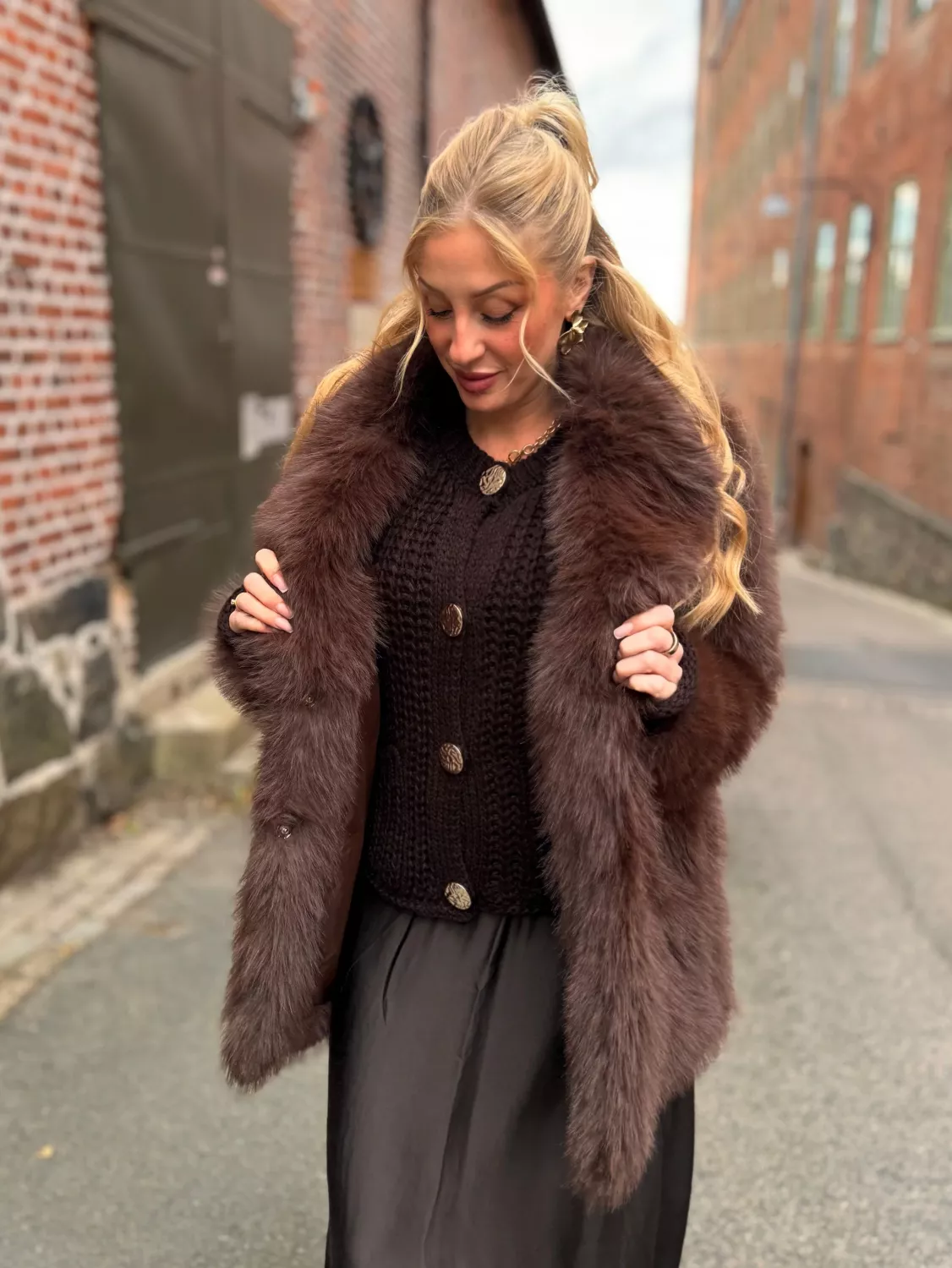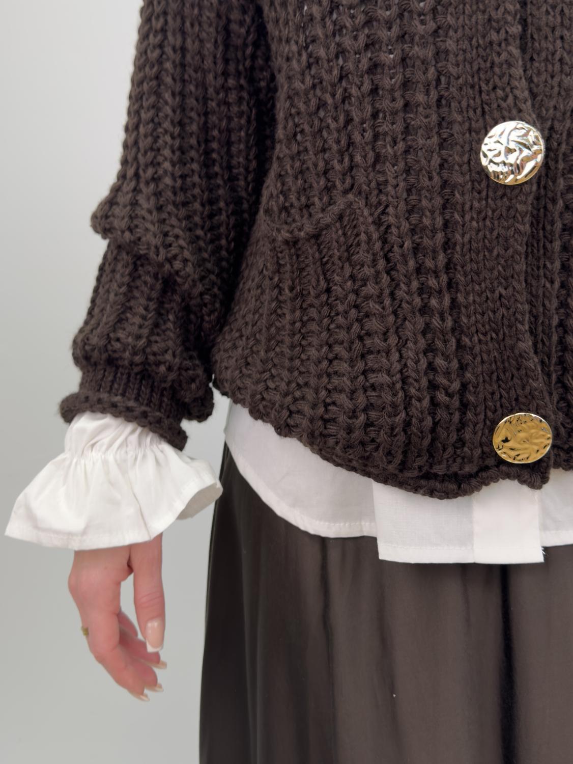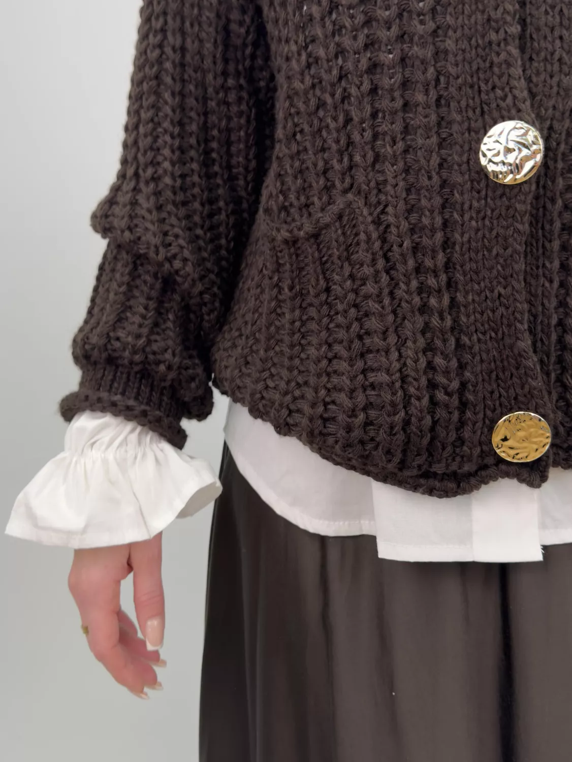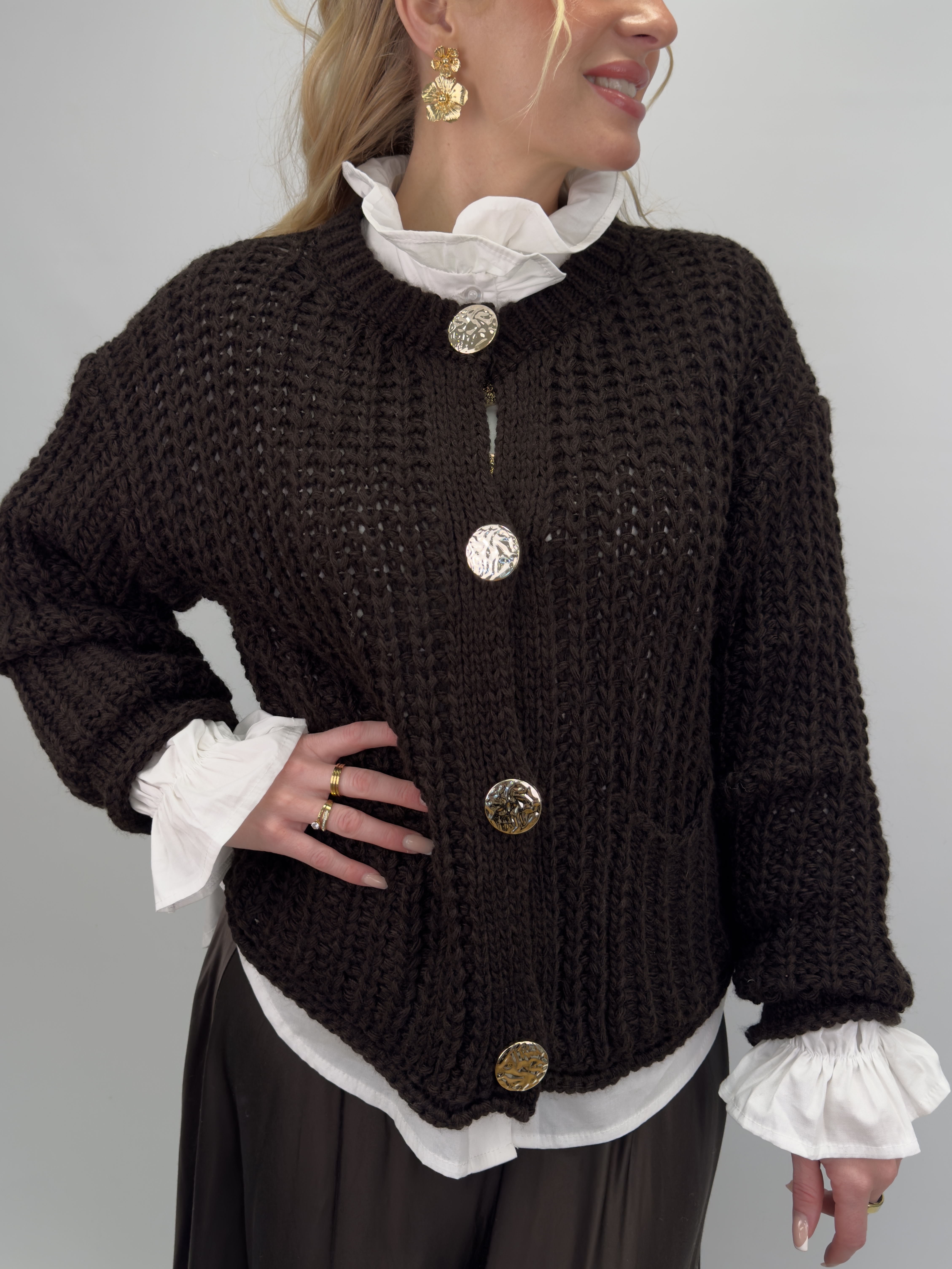 Gudrun är en stickad kofta med dekorativa guldknappar och små fickor fram. Den grovstickade tröjan ger en trendig touch samtidigt som den är lätt att styla med både kjolar och byxor. En chic favorit till både vardag och arbete.