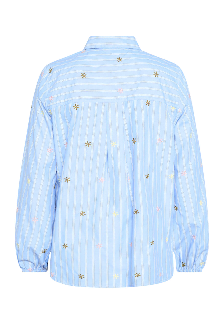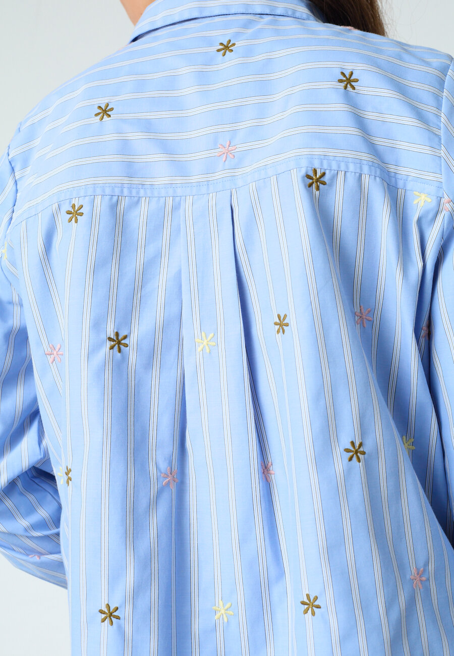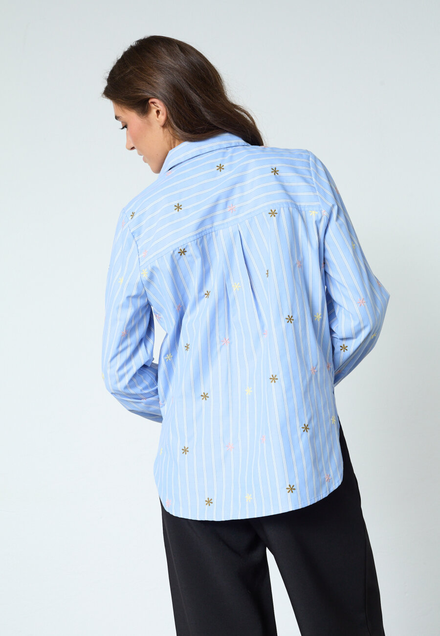 Skjorta med randigt mönster och små broderade stjärnmotiv. Den har en klassisk krage, hellång knappknäppning och långa ärmar med manschetter.