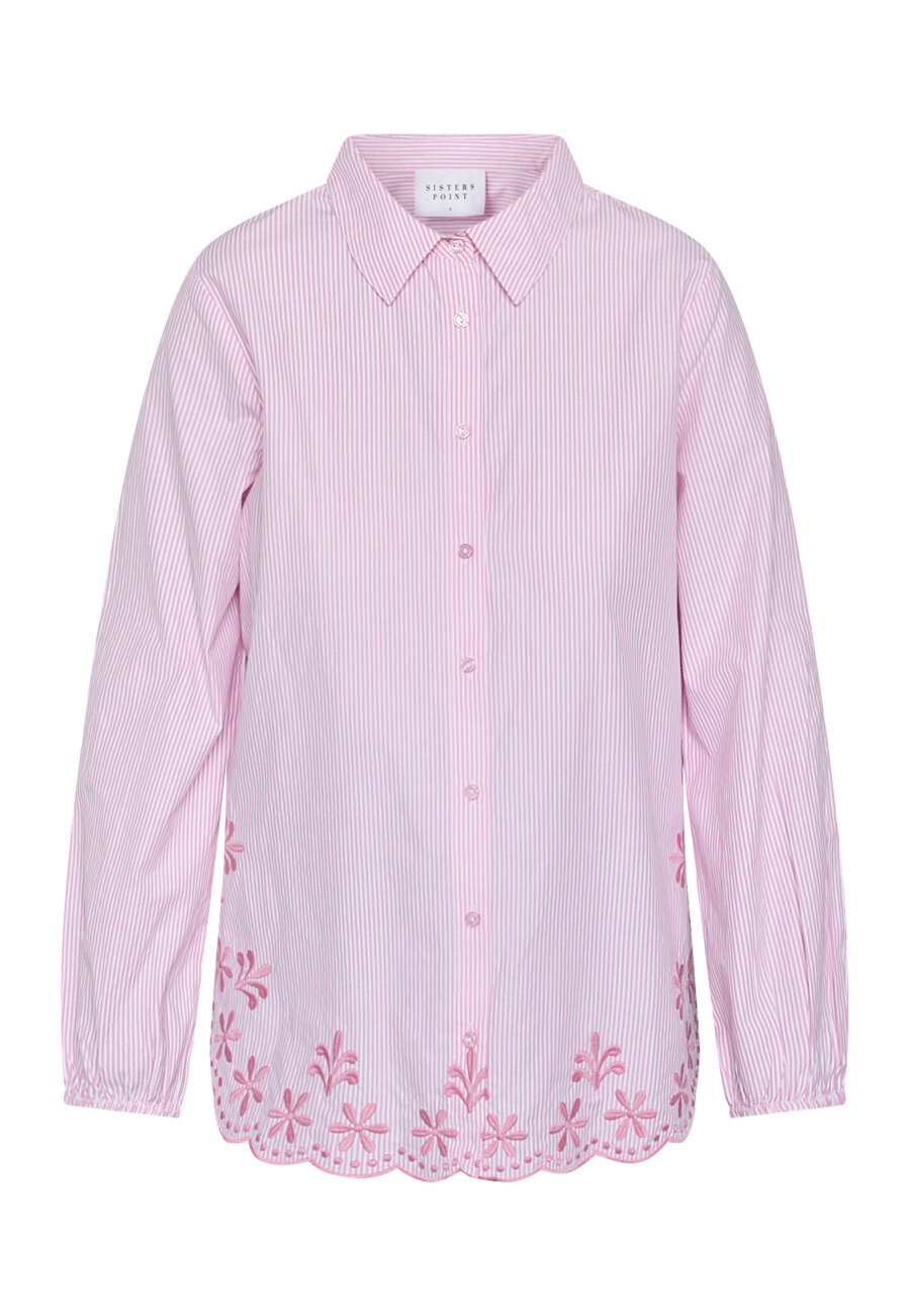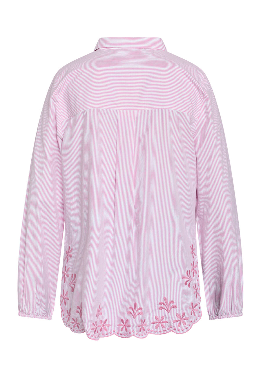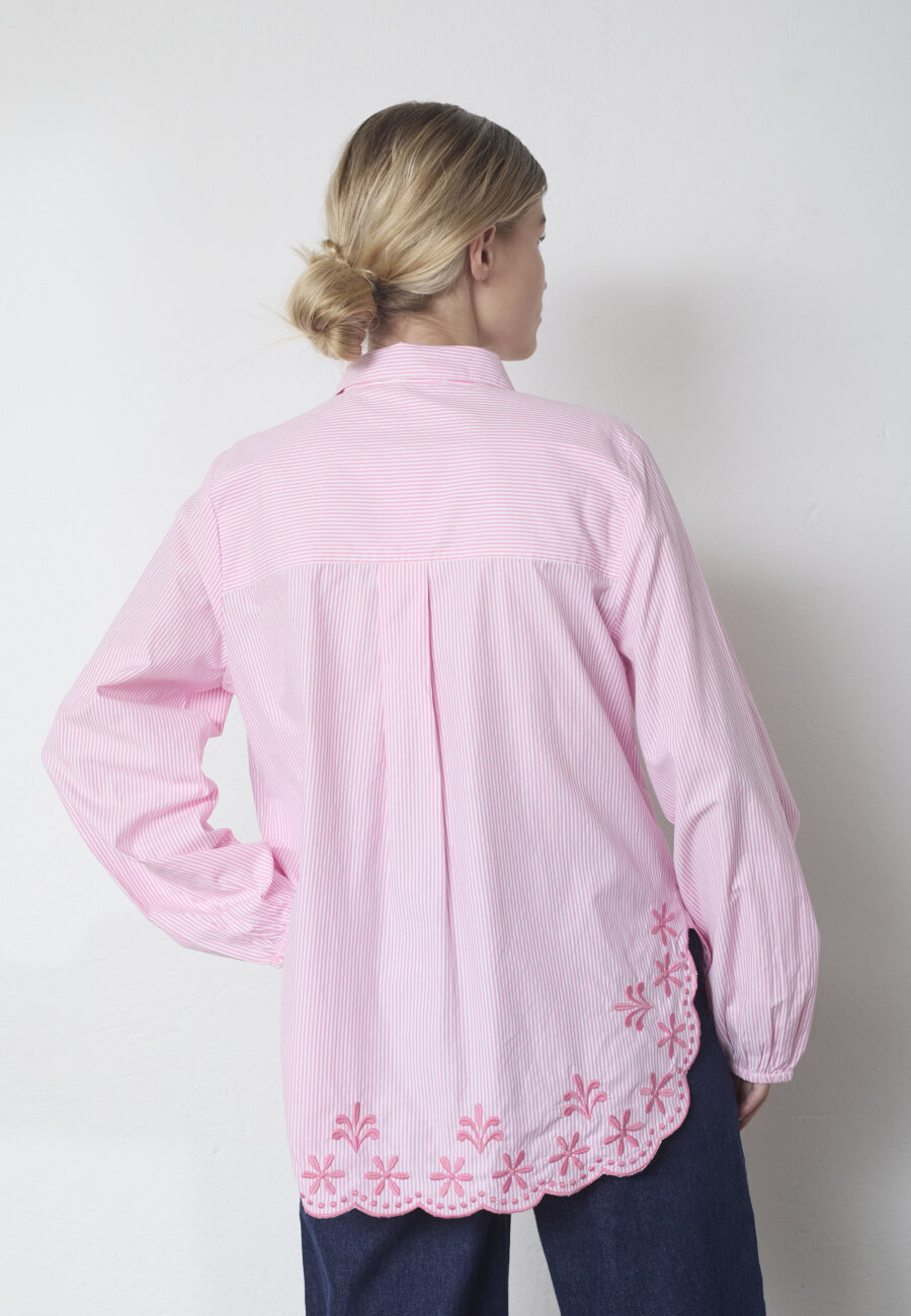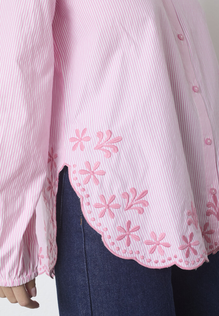 Randig skjorta med klassisk krage och hellång knäppning. Långa ärmar med manschetter, en bröstficka och ett broderat mönster längs fållen.