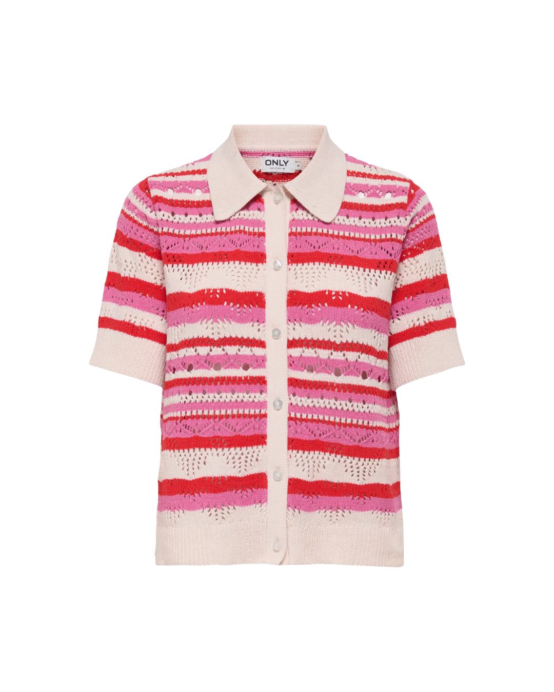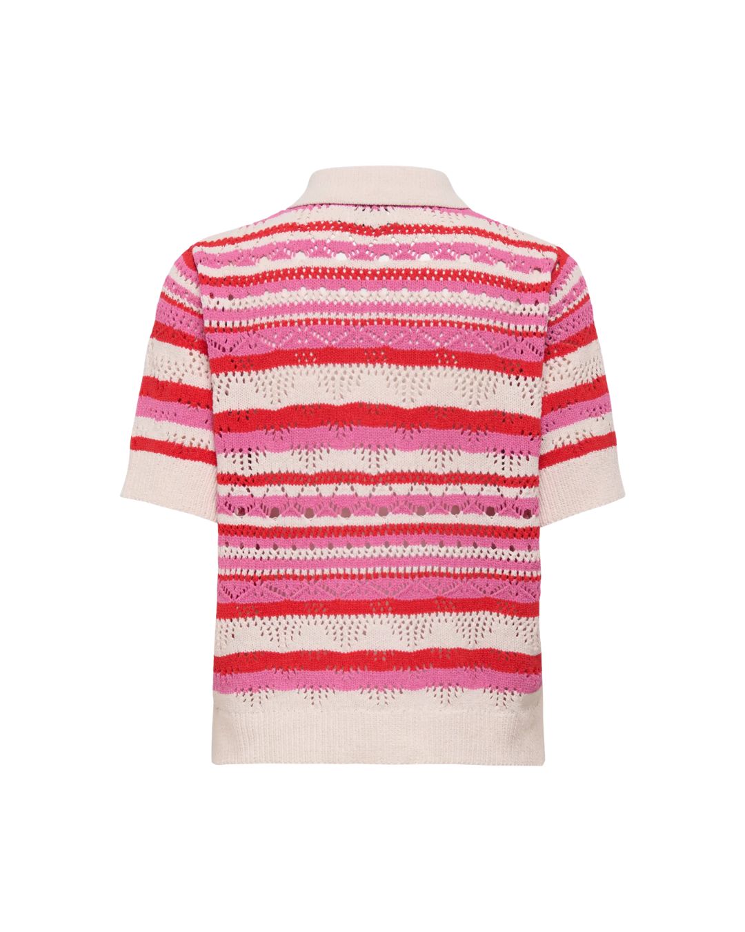Denna topp är tillverkad i 100 % polyester med ribbad flat knit som ger en mjuk och bekväm passform. Den har korta ärmar, klassisk skjortkrage och knappar framtill. Vill du ha variation i stilen går den enkelt att knäppa upp och använda som en lätt kofta – perfekt för både vardag och fest.