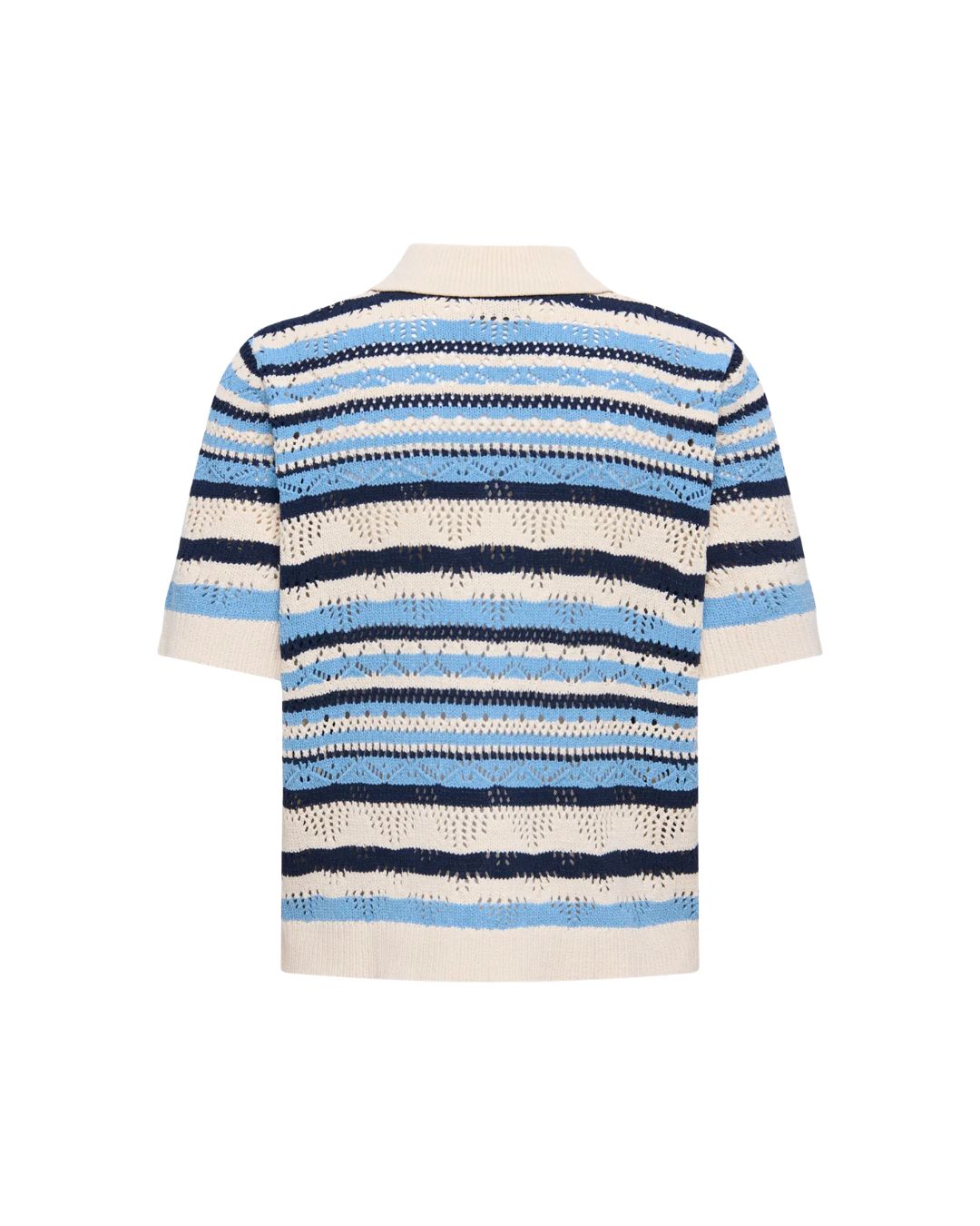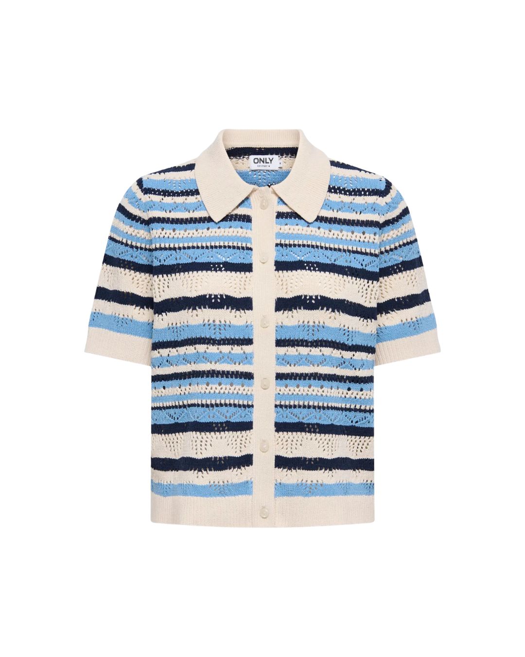 Denna topp är tillverkad i 100 % polyester med ribbad flat knit som ger en mjuk och bekväm passform. Den har korta ärmar, klassisk skjortkrage och knappar framtill. Vill du ha variation i stilen går den enkelt att knäppa upp och använda som en lätt kofta – perfekt för både vardag och fest.