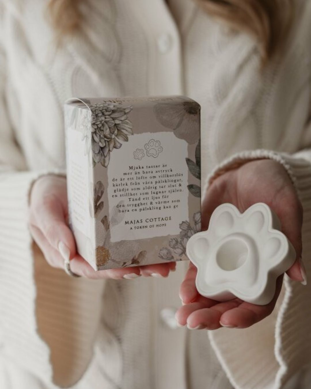 Text: Mjuka tassar är mer än bara avtryck de är ett löfte om villkorslös kärlek från våra pälsklingar, glädje som aldrig tar slut & en stillhet som lugnar själen. Tänd ett ljus för den trygghet & värme som bara en pälskling kan ge. / Soft paws are more than just footprints they are a promise of unconditional love from our furry friends, endless joy & a calm that soothes the soul. Light a candle for the love that only a furry friend can bring.