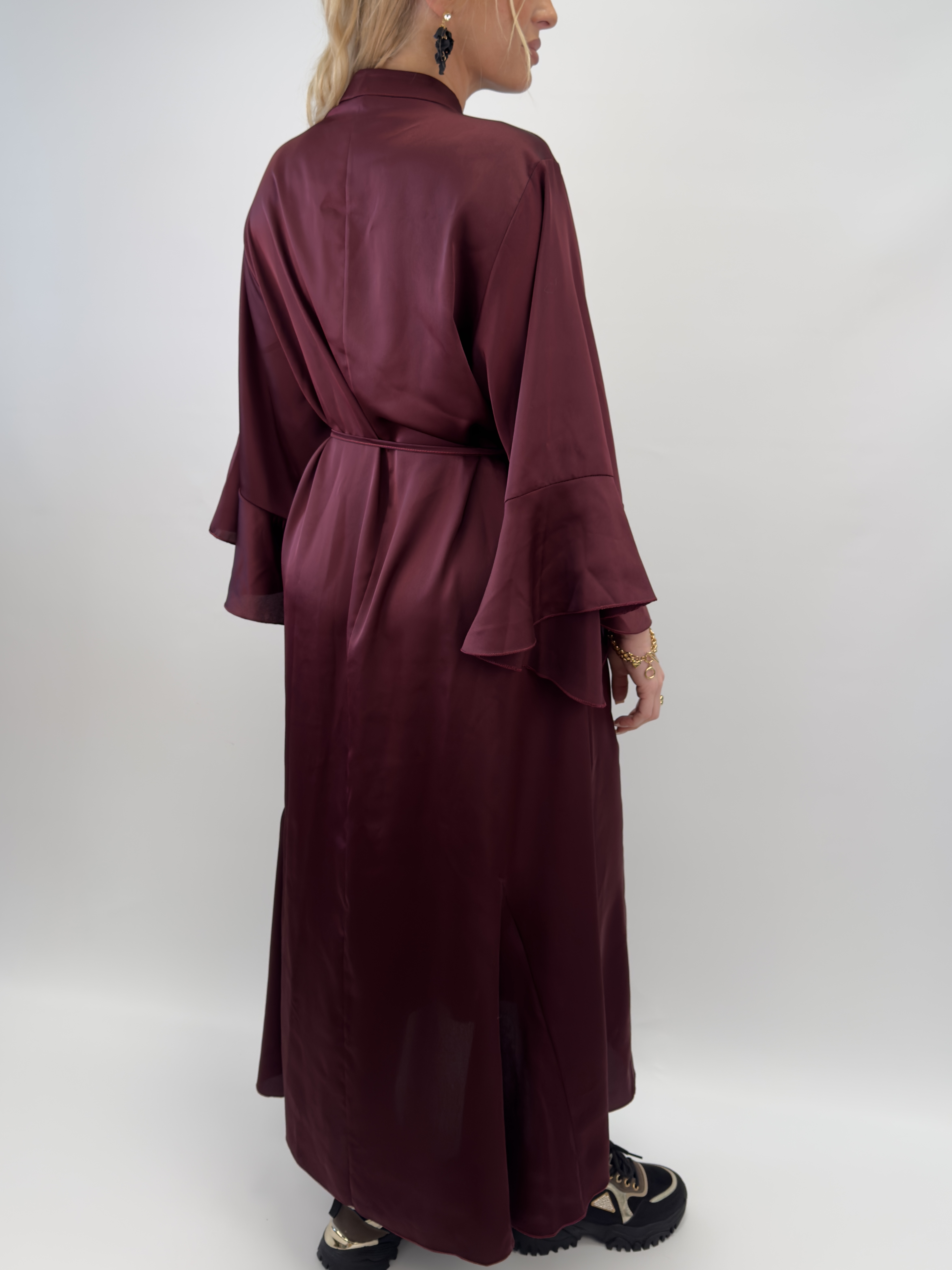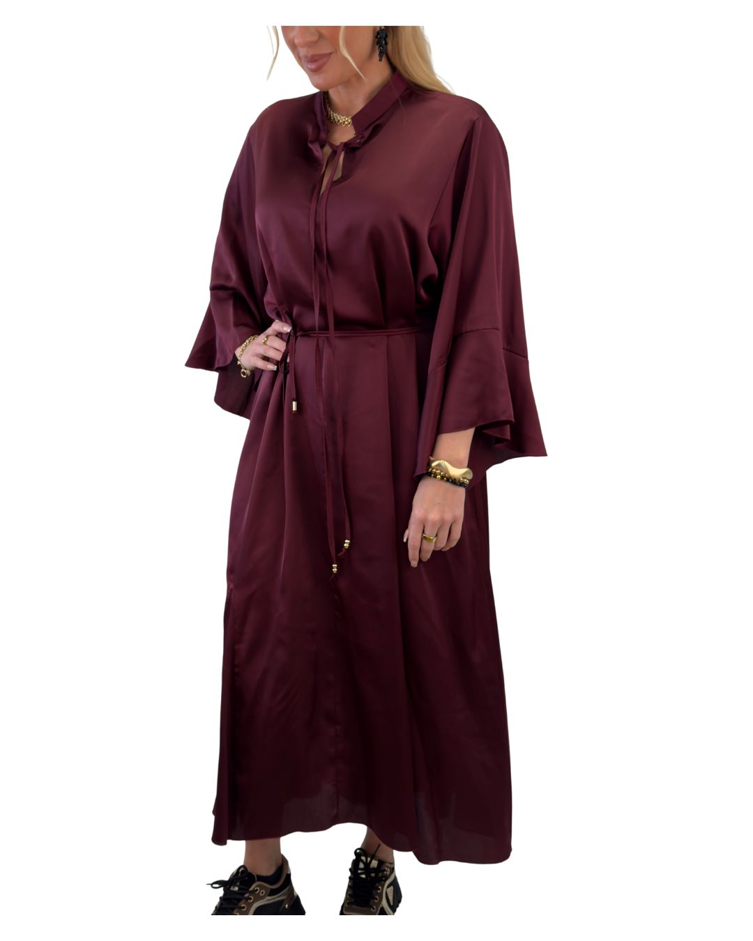 Milly är en elegant maxiklänning med en glänsande finish och midjeslips som smickrar silhuetten. Med vida ärmar och stående krage med slips erbjuder den en sofistikerad look för både avslappnade och festliga tillfällen.