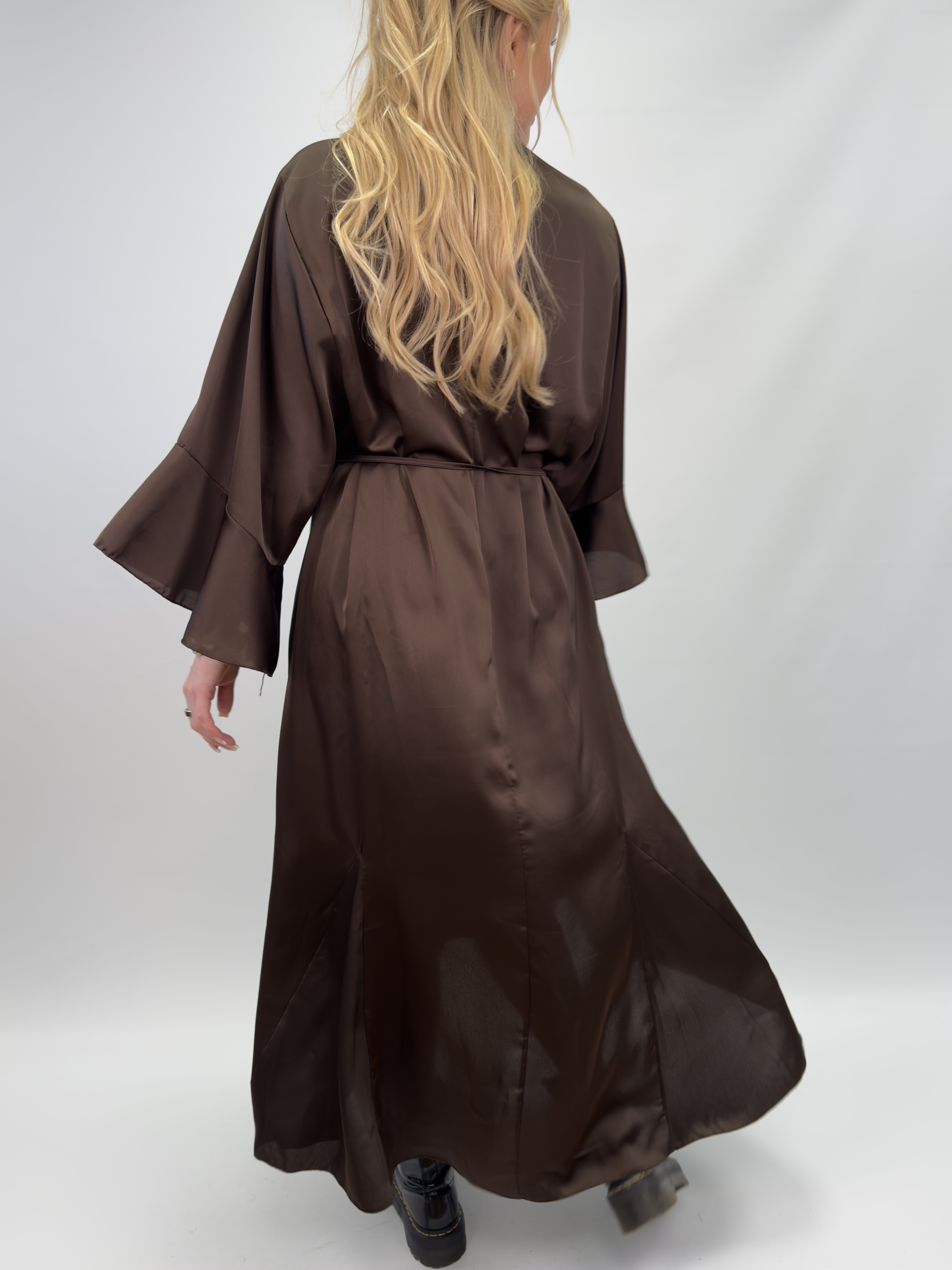 Milly är en elegant maxiklänning med en glänsande finish och midjeslips som smickrar silhuetten. Med vida ärmar och stående krage med slips erbjuder den en sofistikerad look för både avslappnade och festliga tillfällen.