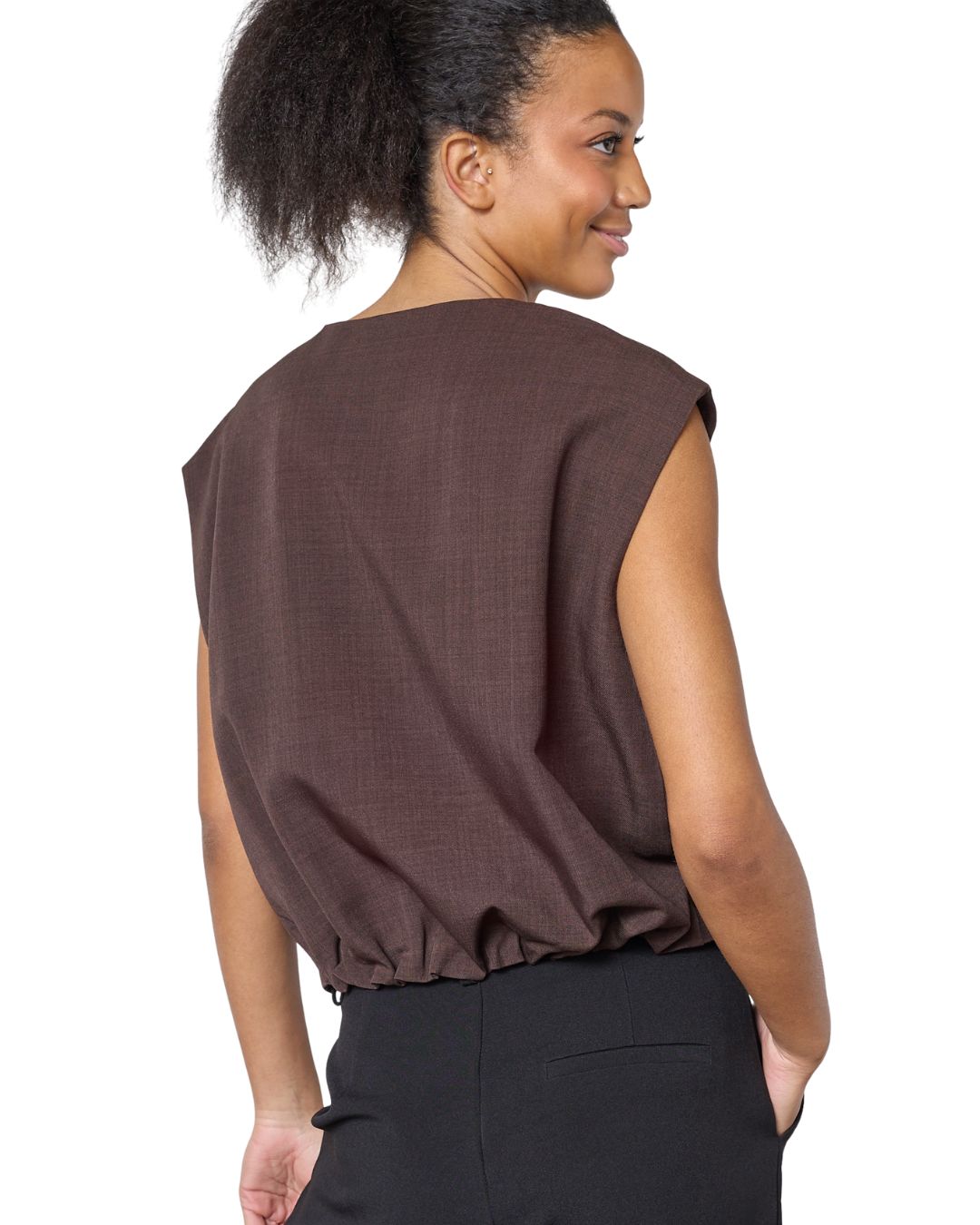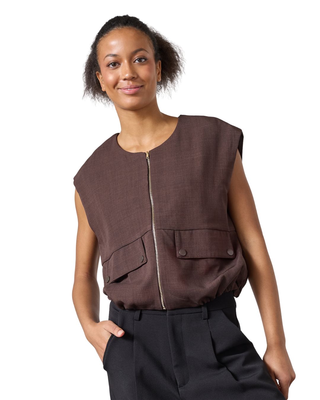 En cool brun väst i ett lätt, strukturerat material. Dragkedja fram, bröstfickor och en elastisk kant längst ner för en perfekt passform.