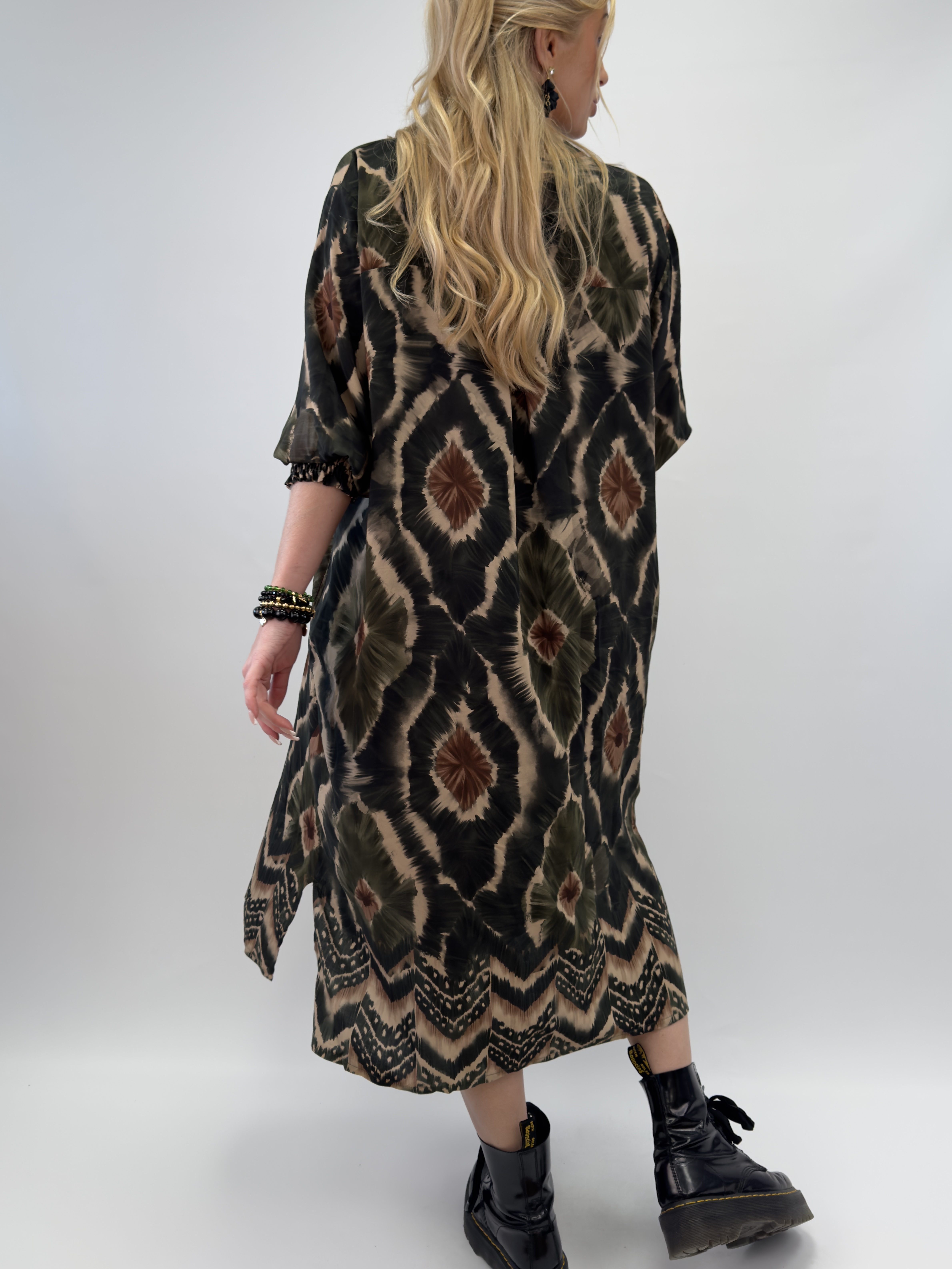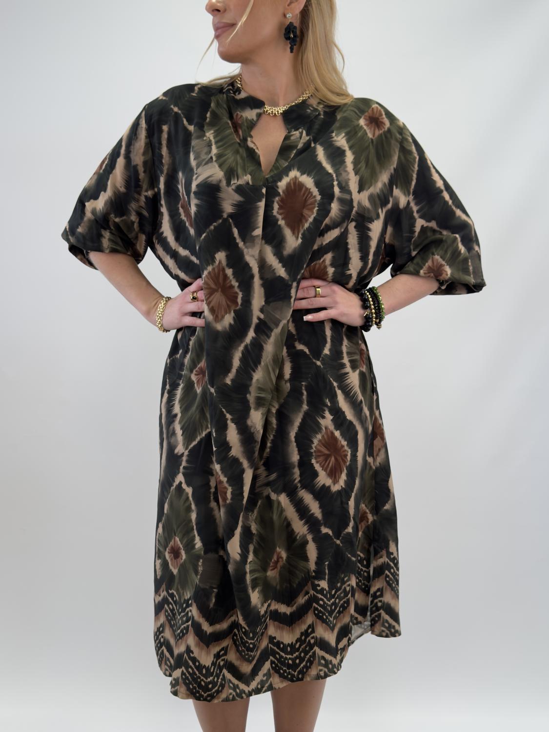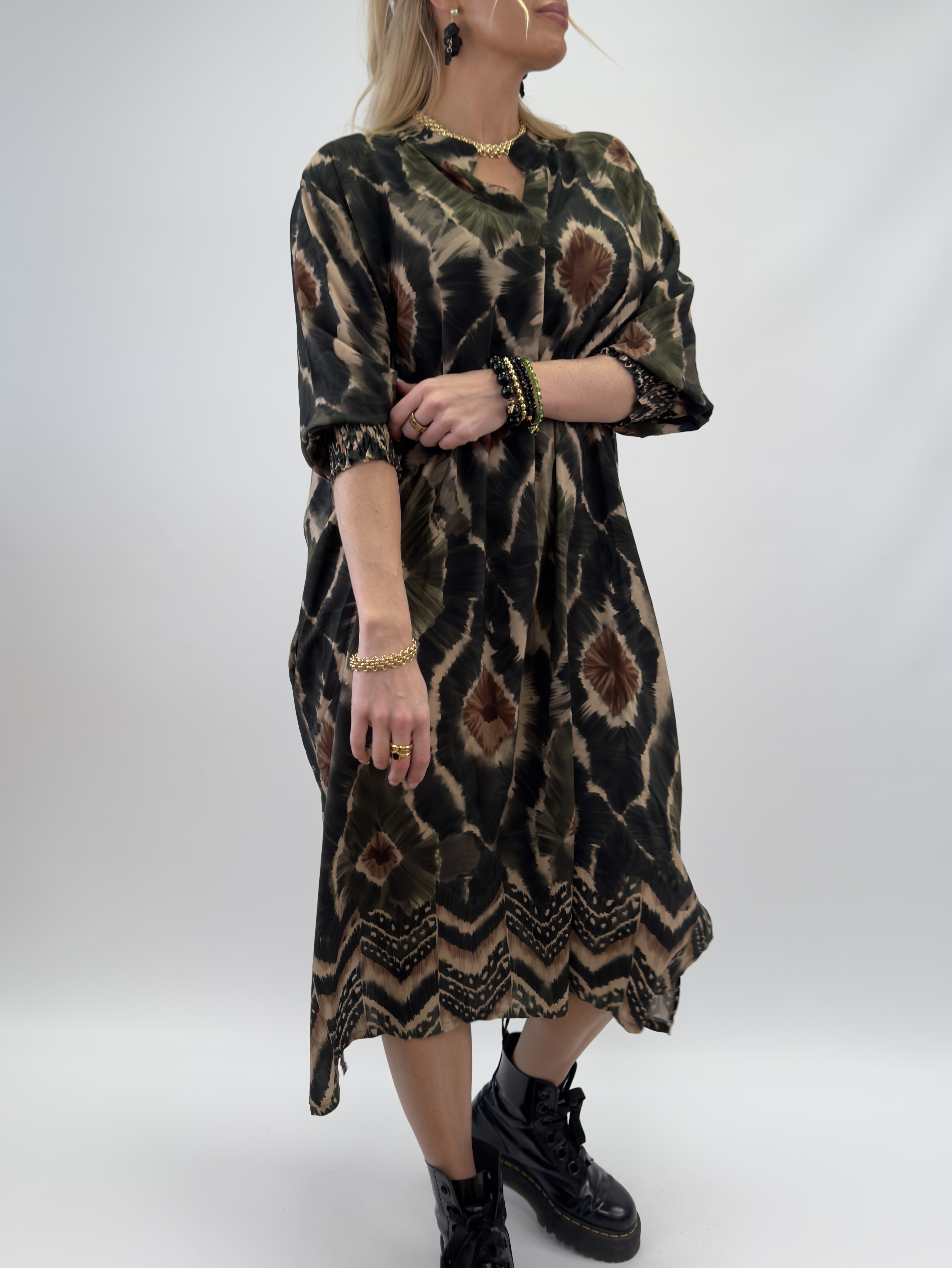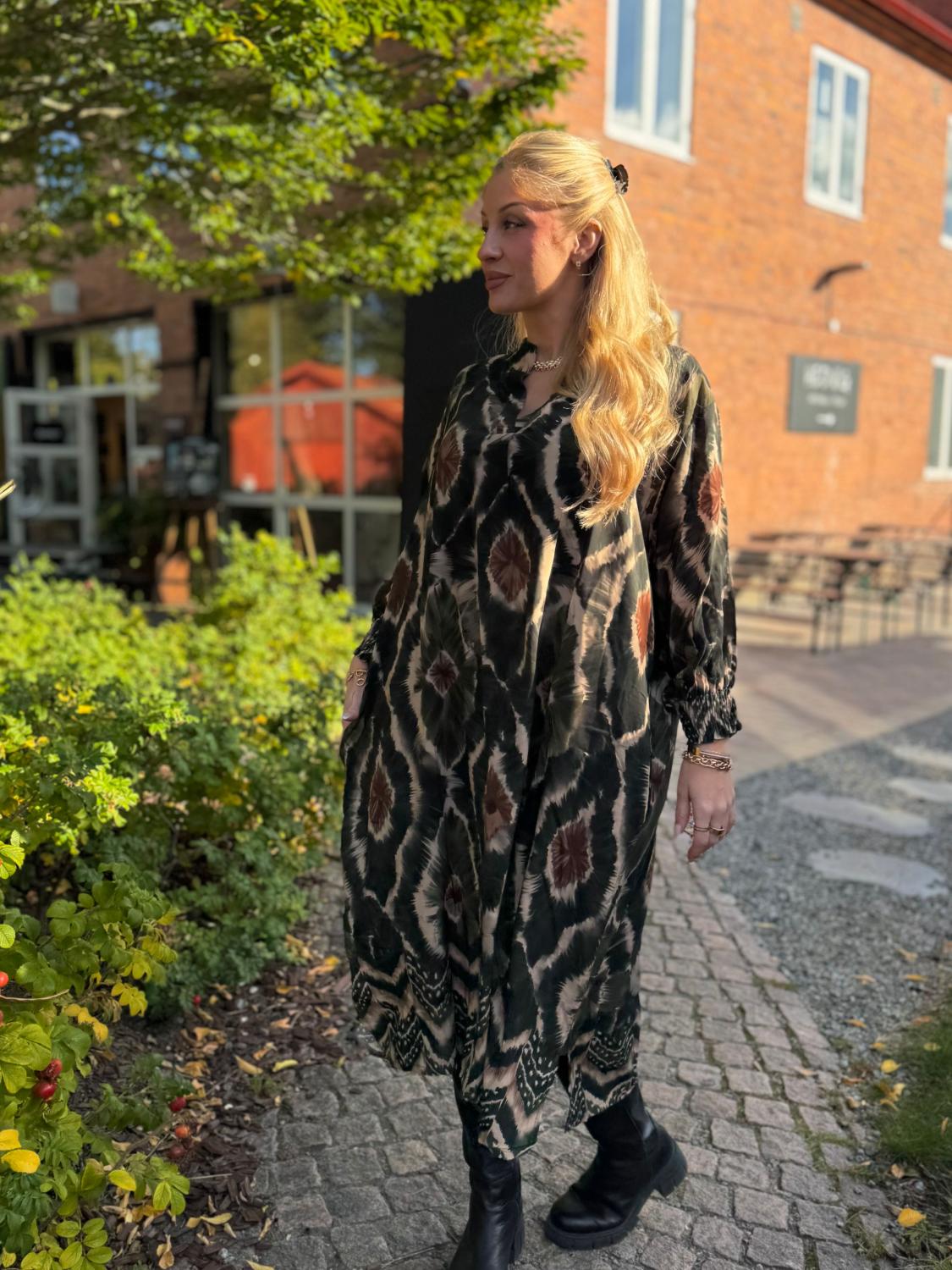 Nora är en böljande midiklänning med grafiskt tryck och avslappnad passform, vilket gör den både bekväm och snygg. Halsringningen med en liten slitsdetalj ger en feminin touch – perfekt för alla tillfällen.