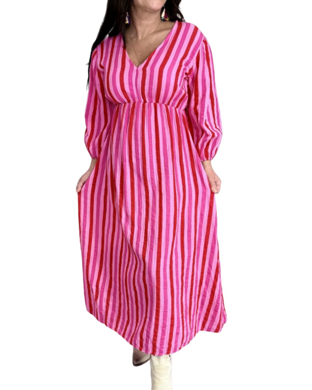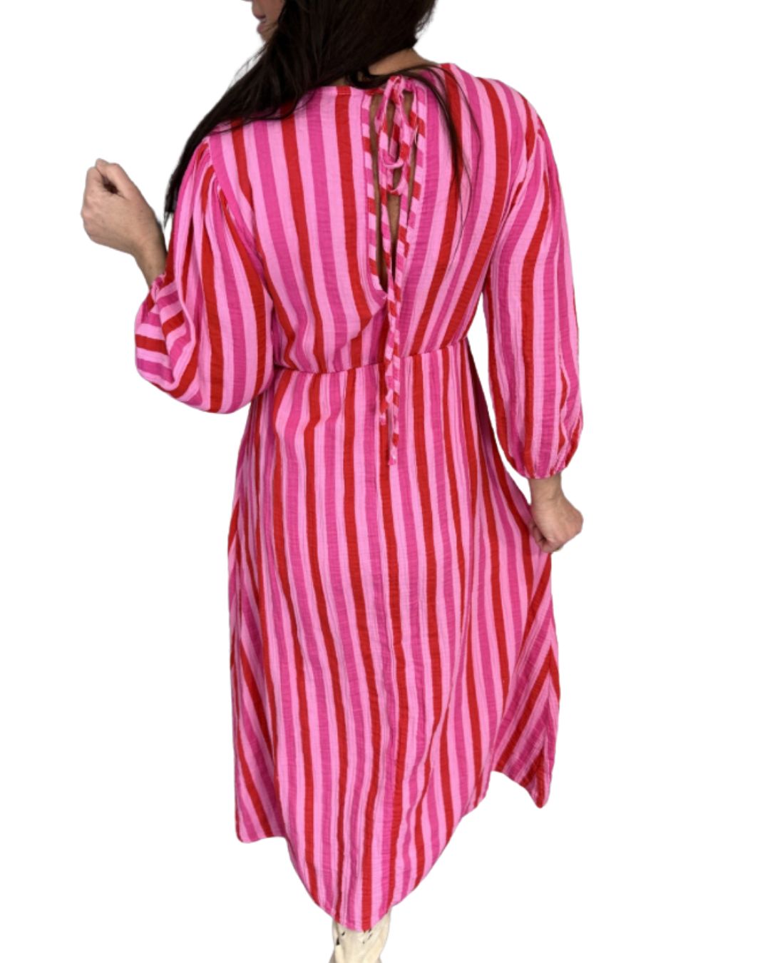 Ge din sommarlook en färgstark twist med denna randiga klänning i rosa och rött. De livfulla ränderna skapar ett modernt och lekfullt uttryck, medan den feminina designen gör den lika smickrande som bekväm. Tillverkad i 100% bomull känns den sval mot huden – perfekt för varma dagar, semestern eller när du vill addera lite vardagslyx till din stil.