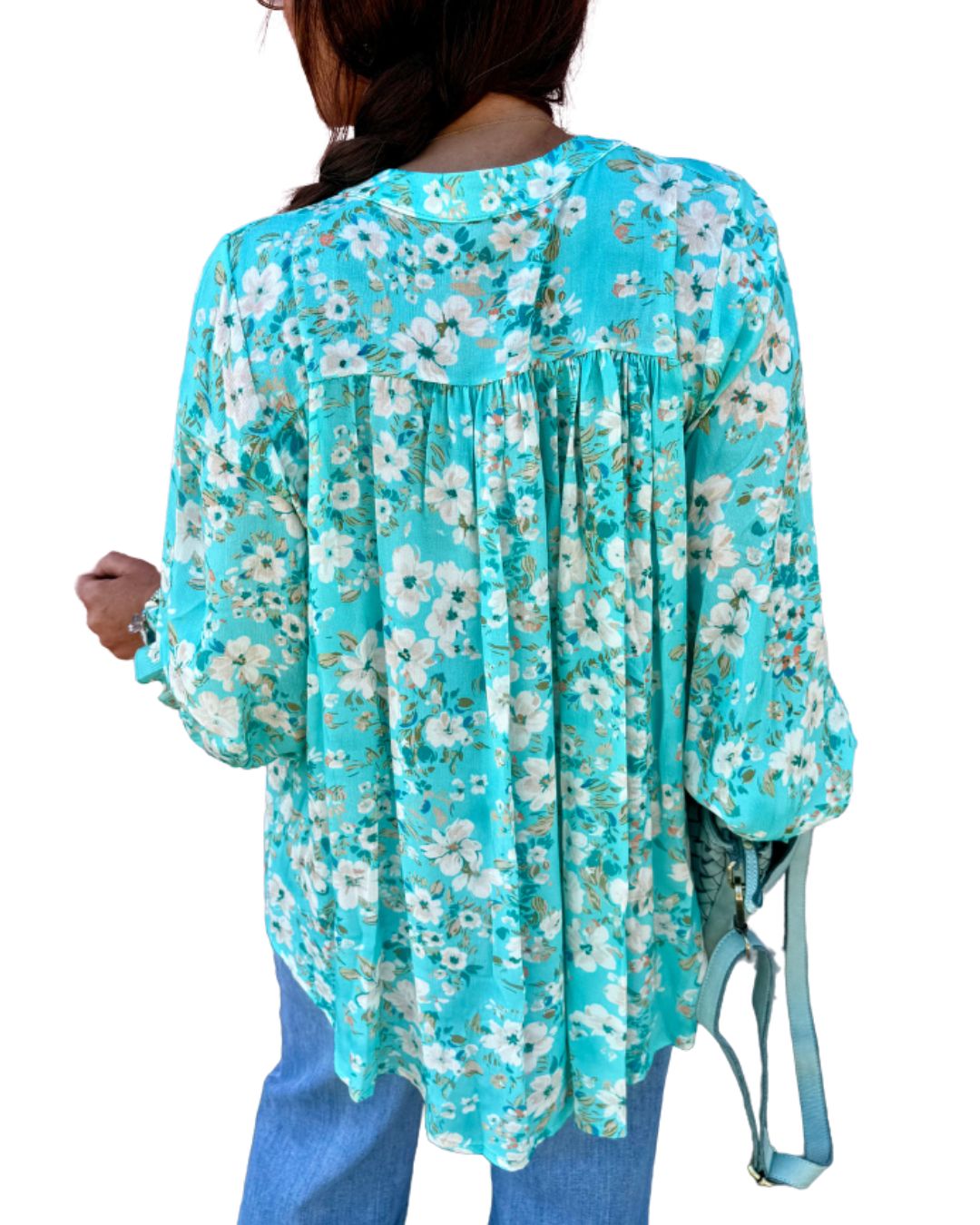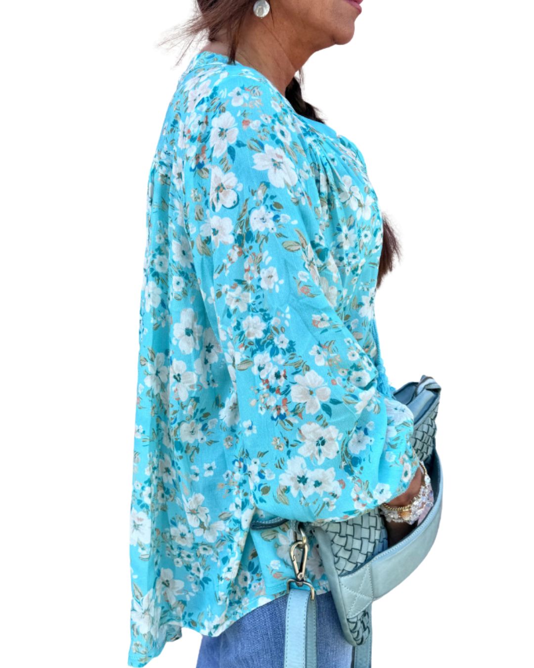 Viskosblus med turkosa blommor & boho-detaljer